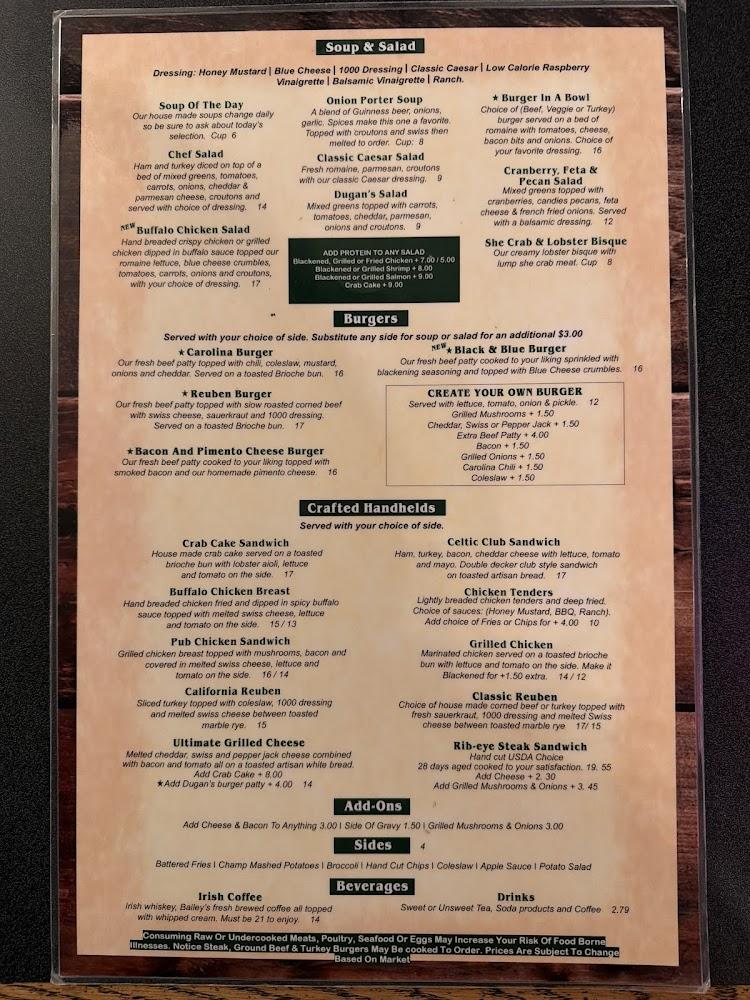 Dugan's Pub offers a full menu that focuses on traditional pub classics. The culinary offerings excite food lovers, featuring dishes like guinness stew and cottage pie. Burgers also take center stage, with the pimento cheese burger receiving high praise. Guests enjoy a range of sides from cheese fries to fresh vegetable medleys. Desserts like the New York cheesecake and English bread pudding round out the meal. Weekly specials keep the menu fresh, reflecting local tastes and favorites.