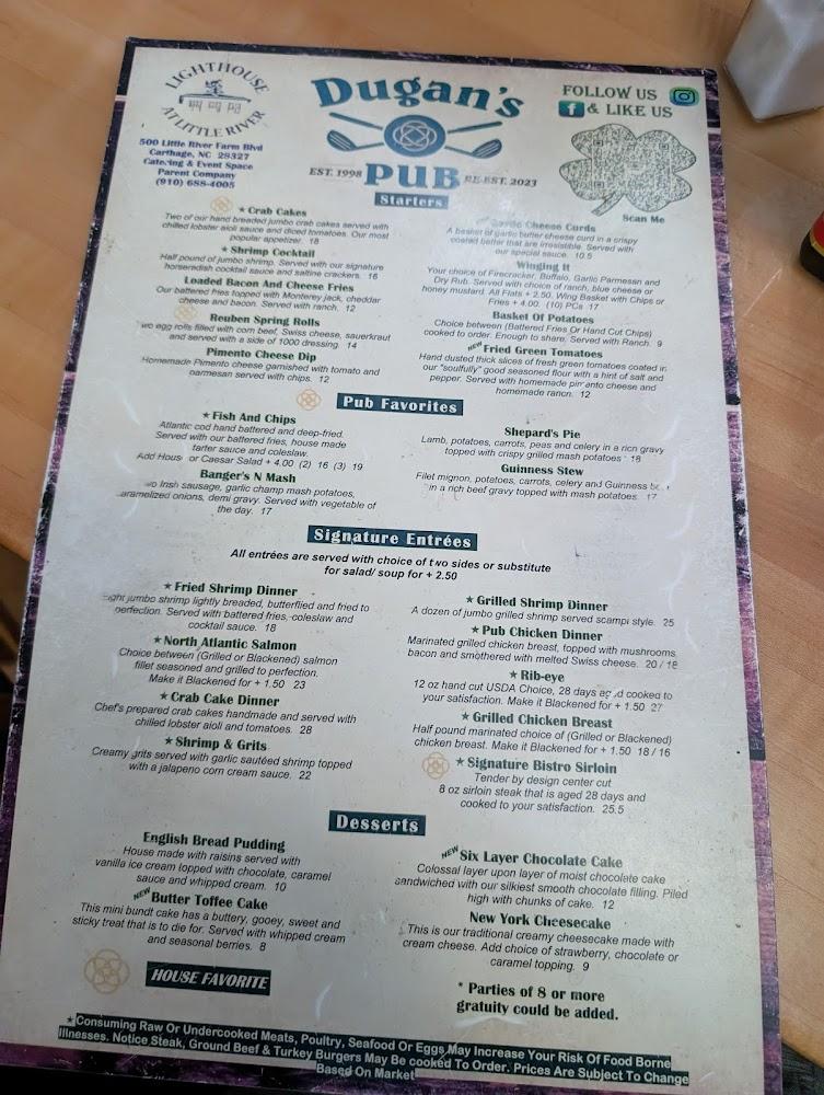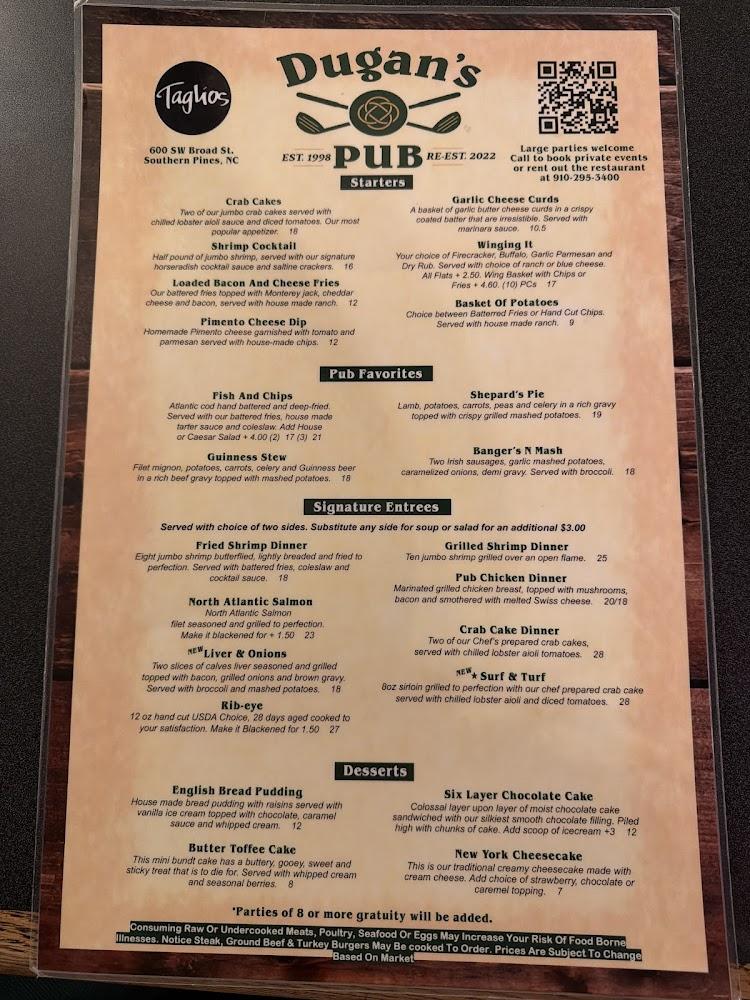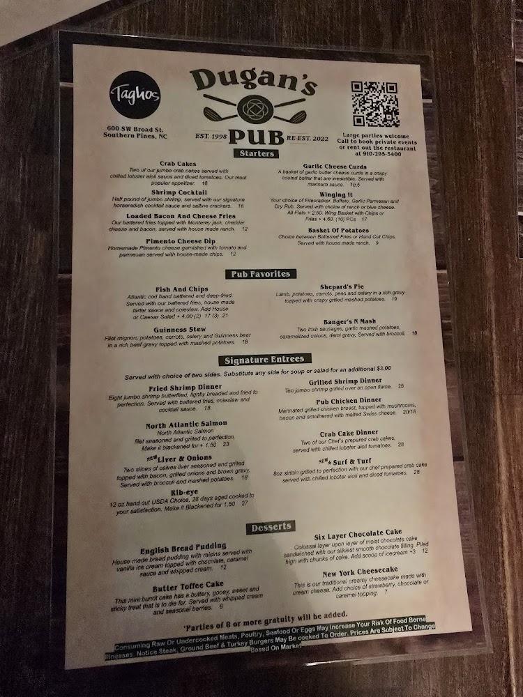 Welcome to Dugan's Pub, the quintessential Irish pub nestled in the charming Village of Pinehurst! Indulge in a delightful menu filled with traditional pub favorites, complemented by enticing weekly food and drink specials. Enjoy live music that adds to the vibrant atmosphere, making each visit memorable. With a wide selection of beers, cocktails, and local specialties, there's something for everyone. Dugan's Pub is the perfect spot for lunch, dinner, or an evening out. Plus, our accessible features ensure everyone can enjoy a fabulous experience. Join us for good food, great company, and lively entertainment at Dugan's!